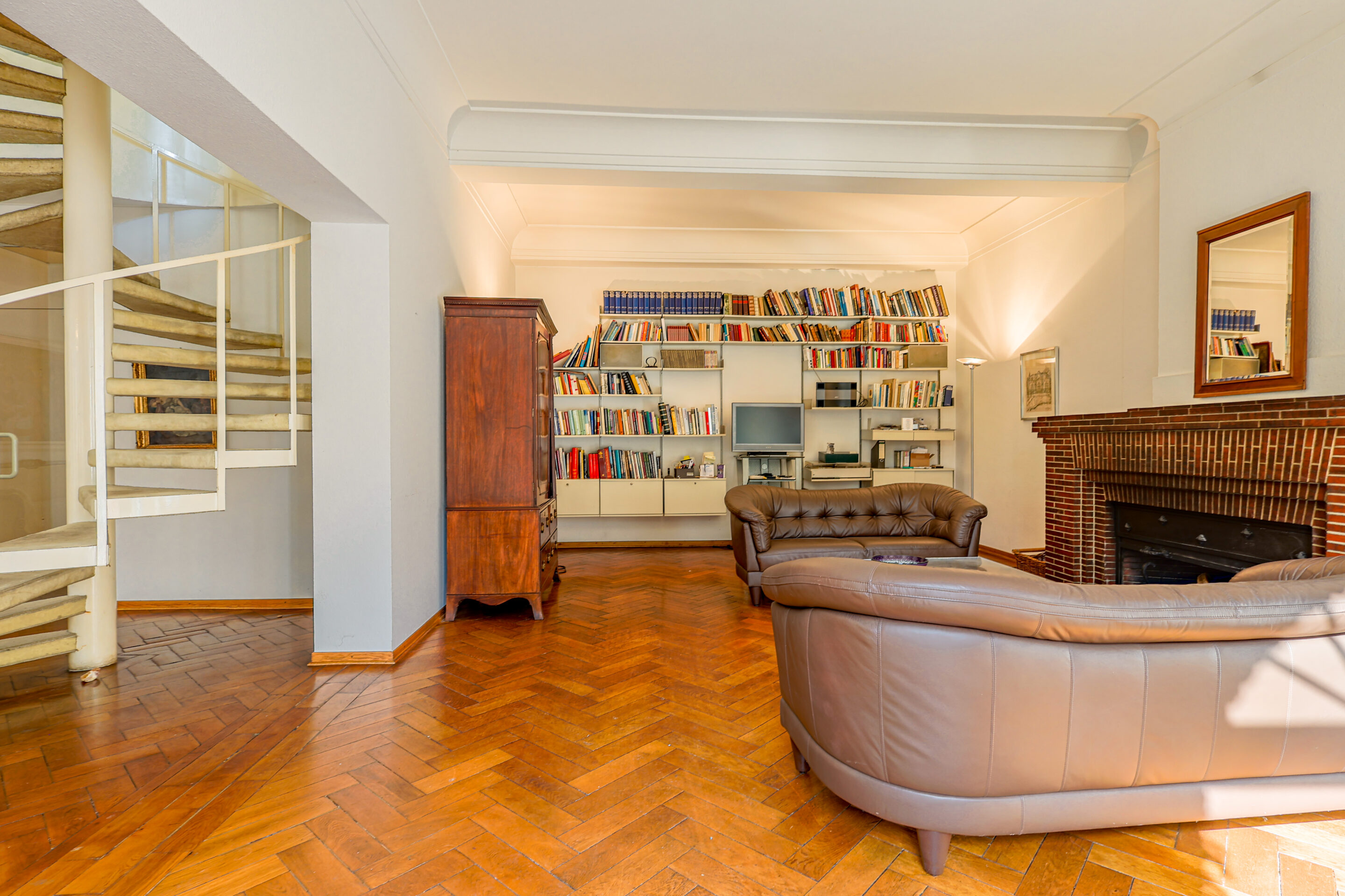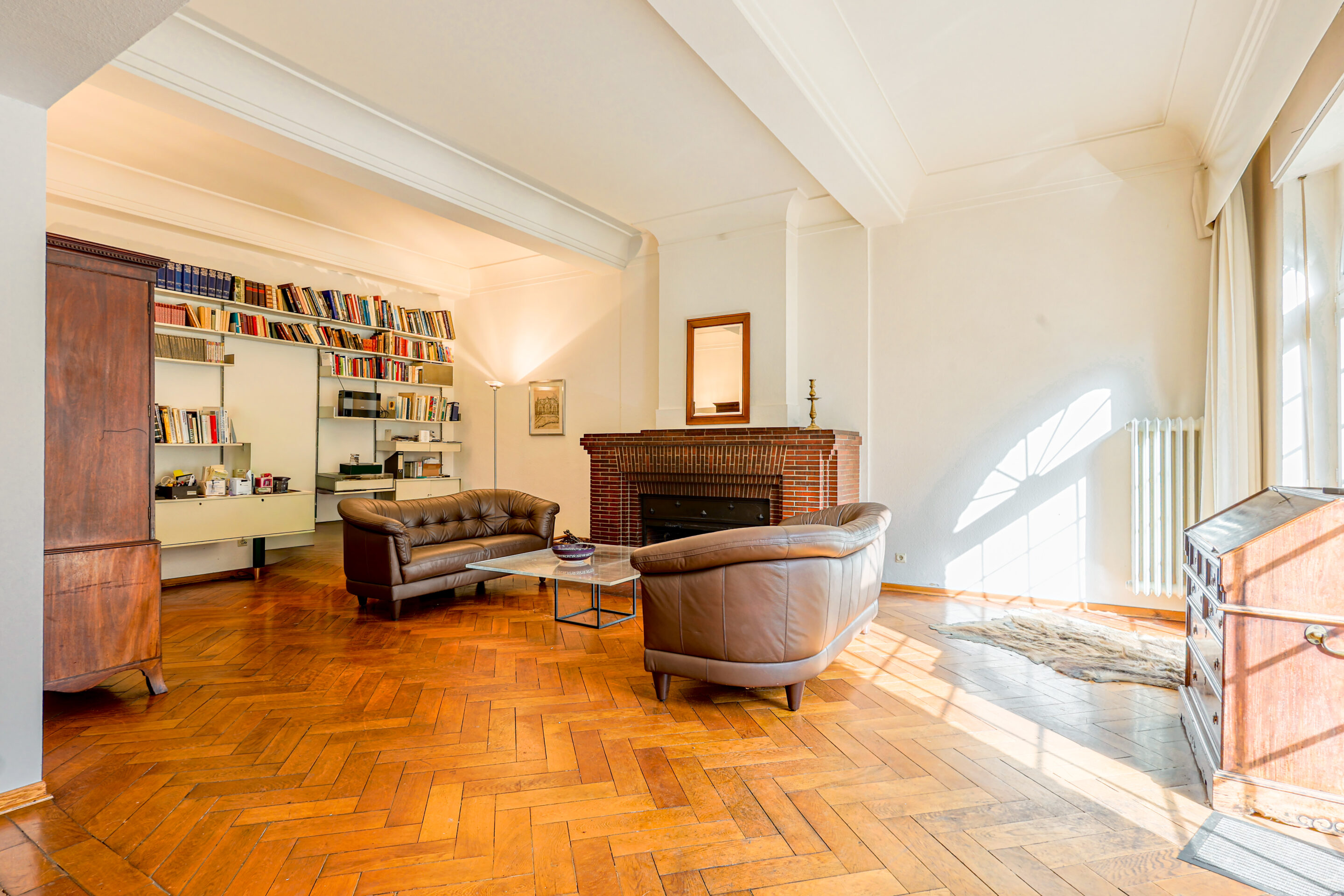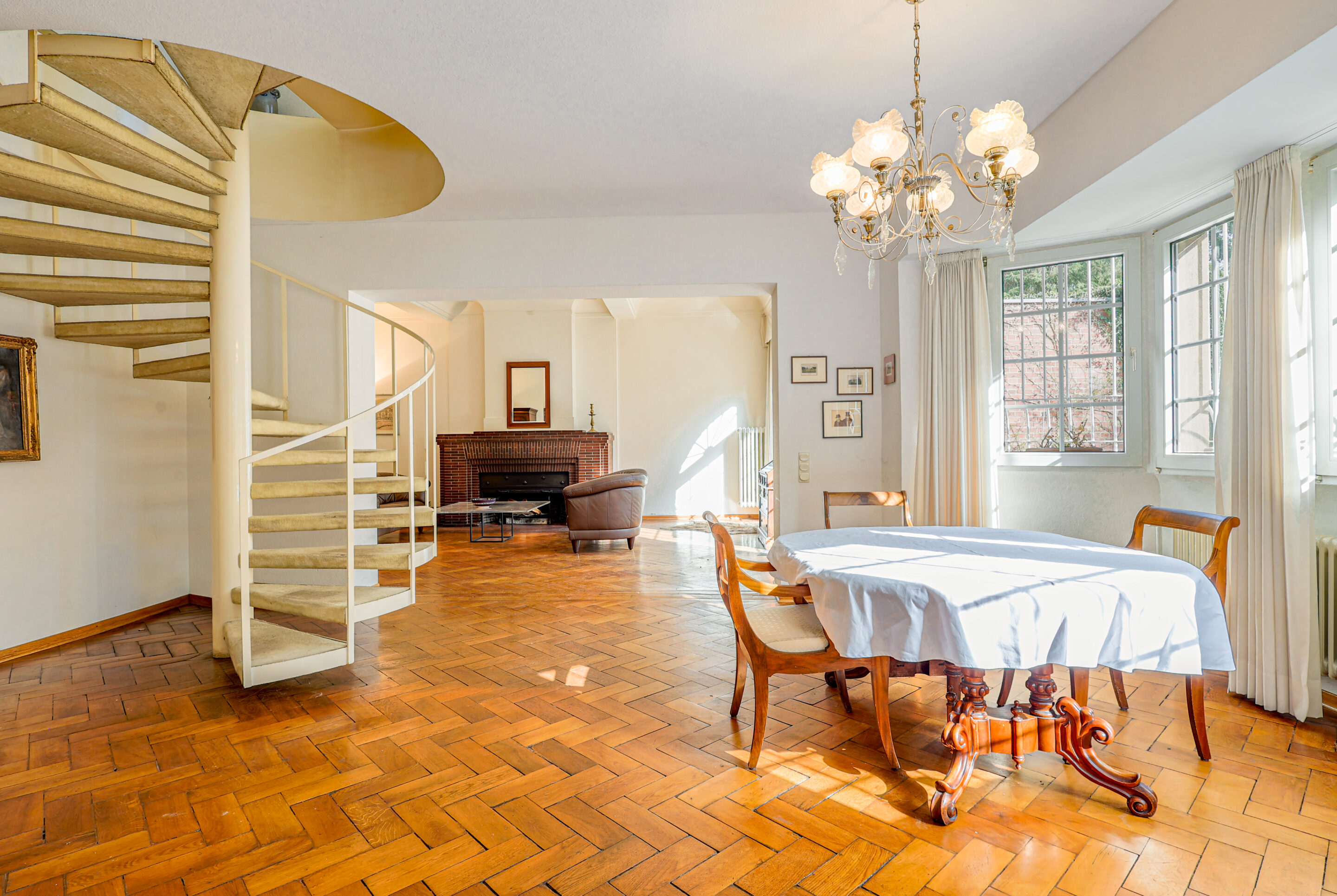 Die größte Einheit ist eine eindrucksvolle Maisonettewohnung, die sich über das Erdgeschoss und einen Teil des Obergeschosses erstreckt und insgesamt ca. 240 m² Wohnfläche bietet. Bereits beim Betreten dieser Einheit wird das außergewöhnliche Raumgefühl deutlich, das insbesondere durch die beeindruckende Deckenhöhe von ca. 3,50 Metern im Erdgeschoss geprägt wird. Original erhaltenes Parkett im Wohnbereich, ein offener Kaminofen sowie der direkte Zugang zum liebevoll angelegten Garten mit kleinem Teich und großzügiger Terrasse unterstreichen den repräsentativen Charakter dieser Wohnung und schaffen eine besondere Wohnatmosphäre.