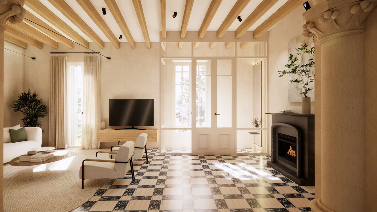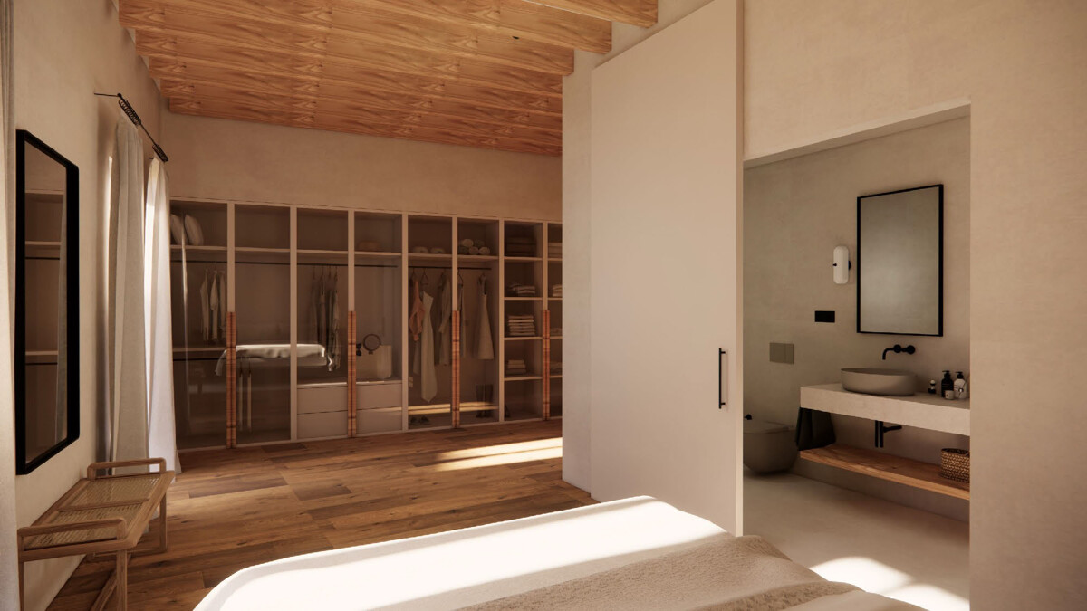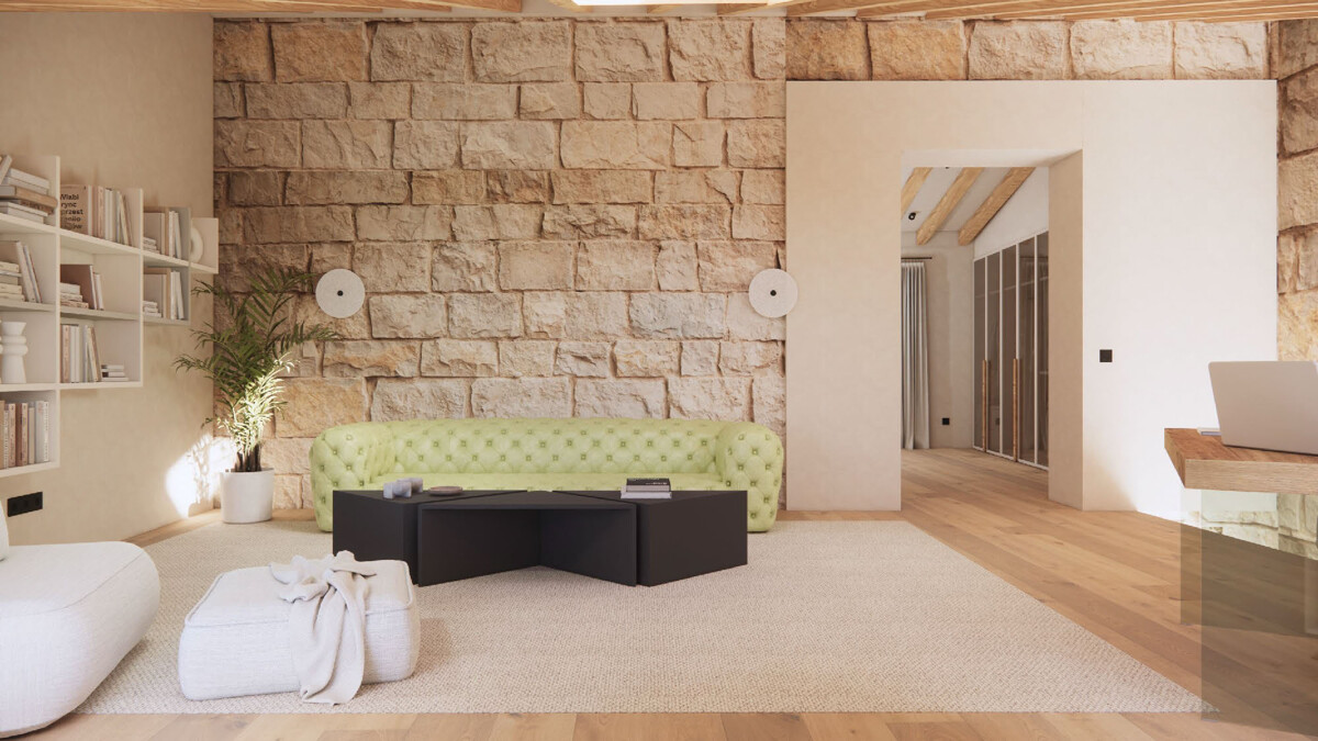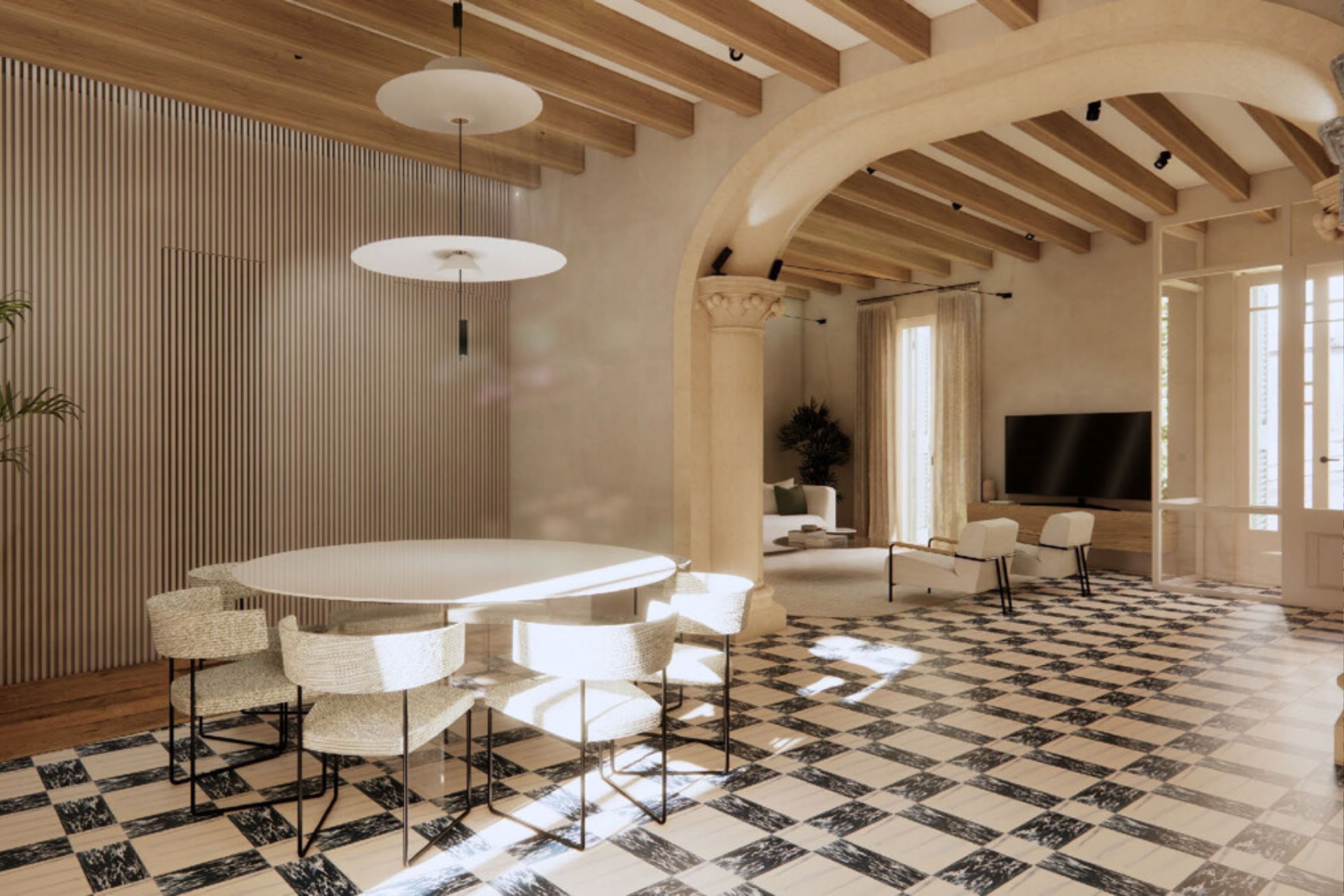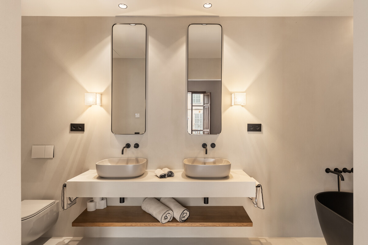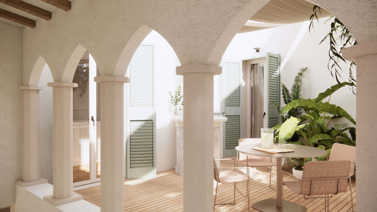 Die Residenz selbst fügt sich mit einer zurückhaltenden, mediterran inspirierten Fassade unauffällig in das Ortsbild ein und überrascht im Inneren mit beeindruckend restaurierten Räumen. Steinmauern, handgefertigte Zementfliesen und traditionelle Holzläden erinnern an das mallorquinische Erbe, das hier auf modernen Komfort trifft.