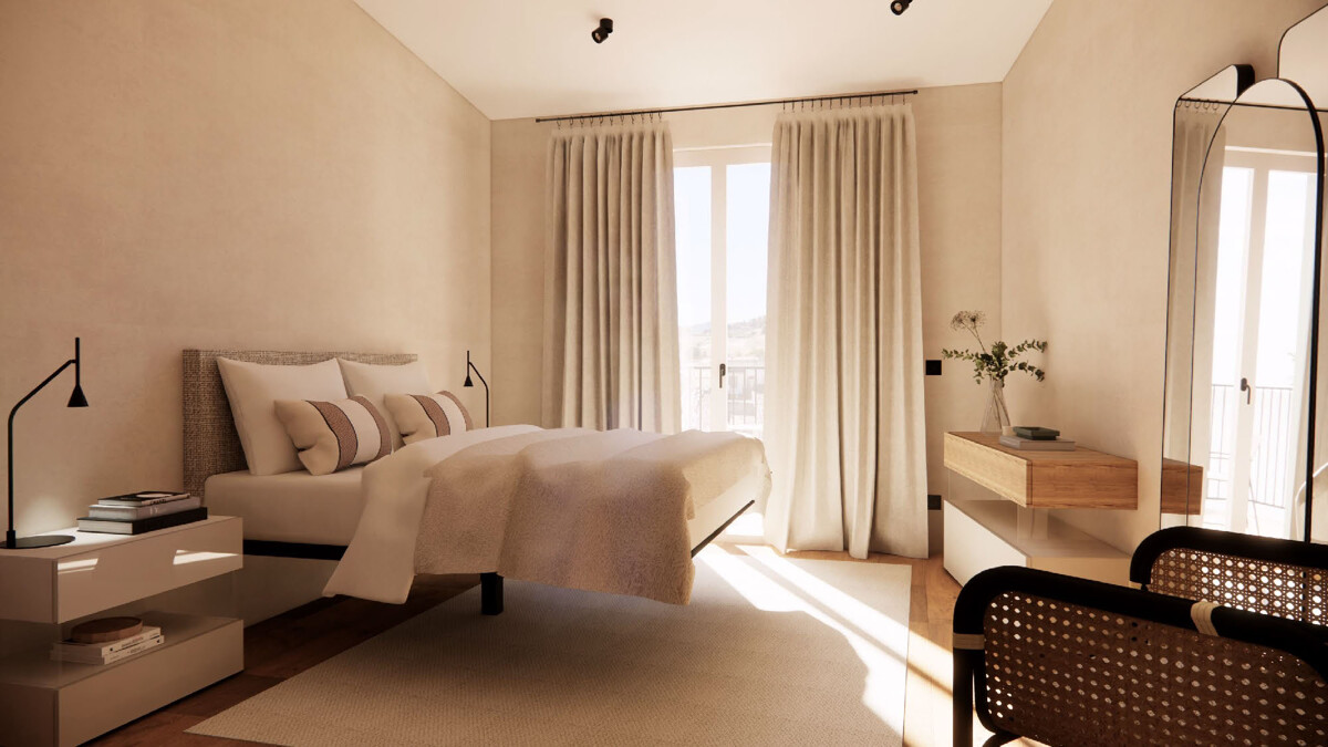 Die Innenräume sind lichtdurchflutet, verfügen über hohe Decken und elegante Oberflächen. Originale Steinbögen und handverlesene Materialien schaffen eine harmonische Verbindung aus historischem Charakter und zeitgenössischem Design.