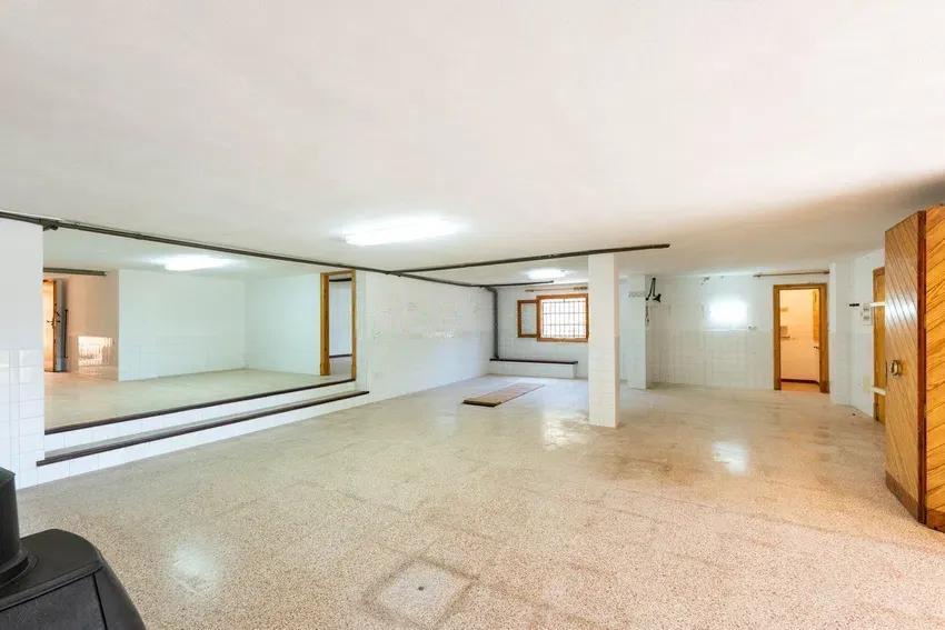 Die untere Ebene bietet ein charmantes Porche mit Natursteinbögen, einen großen offenen Raum, ein Badezimmer sowie zwei weitere Räume. Diese Etage eröffnet vielfältige Nutzungsmöglichkeiten, etwa als separates Gästeapartment, als Doppelgarage mit Abstell- und Hauswirtschaftsflächen oder als voll integrierter Wohnbereich.