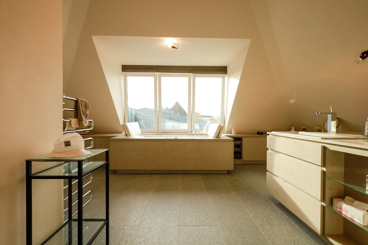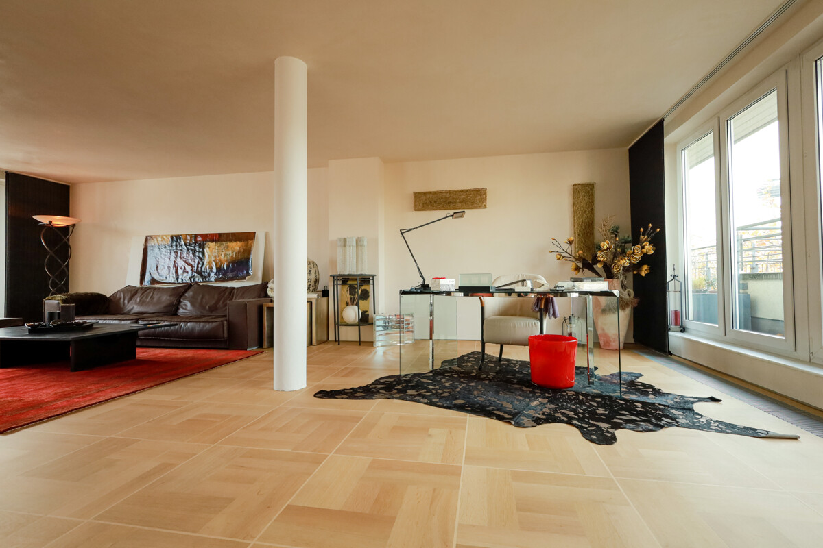 Abgerundet wird die obere Etage durch ein ruhiges Arbeitszimmer mit eigenem Balkon sowie eine private Sauna. Trotz des bewusst offenen Grundkonzepts lässt sich die Fläche bei Bedarf flexibel so strukturieren, dass bis zu drei abgeschlossene Zimmer entstehen könnten – ohne den architektonischen Gesamteindruck zu beeinträchtigen.