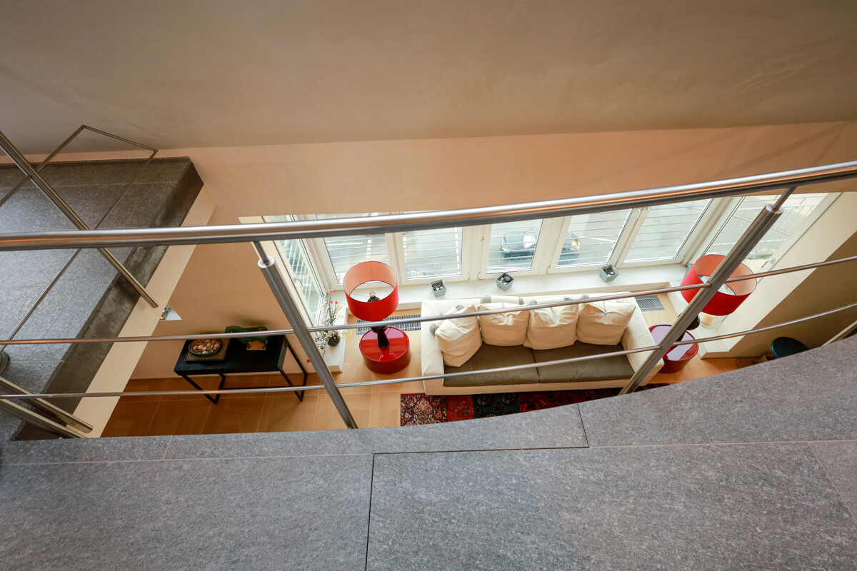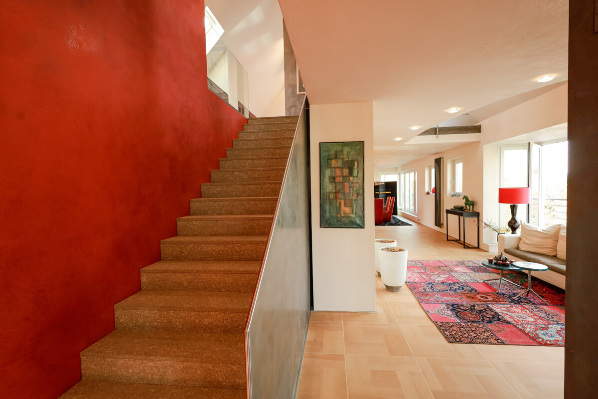 Die breite Steintreppe führt in den oberen Wohnbereich, der durch seinen Galeriecharakter besticht: Teilweise offene Bodenbereiche lassen bewusst Durchblicke in die untere Etage zu und unterstreichen das luftige, atelierartige Wohngefühl. Der Steinboden, die umfangreichen Glasflächen und die Vielzahl an Fenstern – auch hier inklusive Dachverglasungen – schaffen ein Ambiente voller Leichtigkeit und Transparenz.