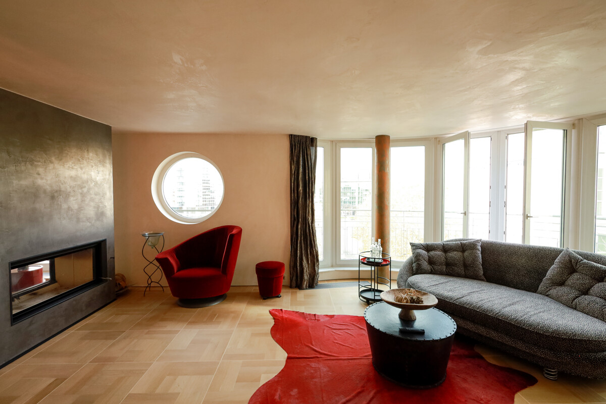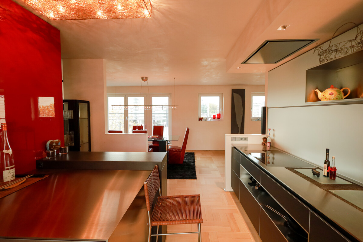 Der untere Wohnbereich beeindruckt mit weitläufigem Parkettboden und einem offenen Raumfluss ohne geschlossene Grenzen. Großflächige Fensterfronten, markante Bullaugenfenster und zusätzliche Dachfenster sorgen für eine beinahe durchgängige Verglasung, die den Raum in warmes Licht taucht. Die Deckenhöhe, die Transparenz und die klare Linienführung verstärken den Loft-Charakter. Ein moderner Kamin sowie die elegant integrierte Designerküche mit Hochbank fügen sich selbstverständlich in das fließende Gestaltungskonzept ein. Von Küche, Wohn- und Essbereich öffnen sich drei Balkone, die einen weiten Blick über die Dächer Kölns freigeben.