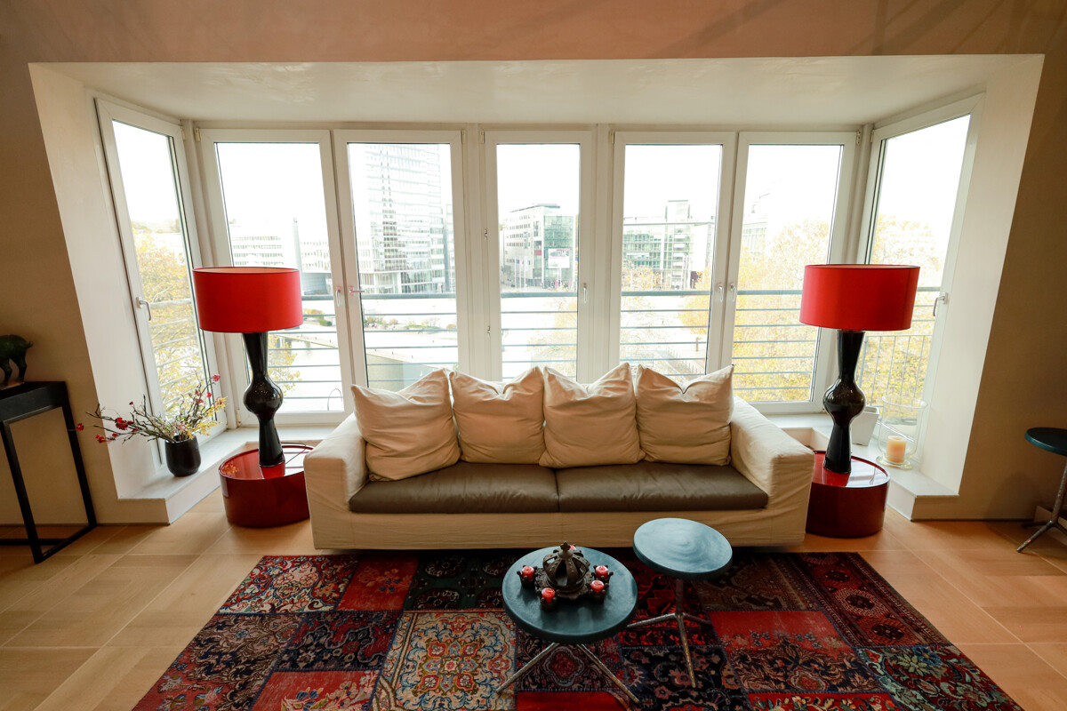 Der Ausblick ist eines der besonderen Highlights: Von nahezu jedem Punkt des Penthouse-Lofts schweift der Blick weit über den gesamten MediaPark, den markanten Springbrunnen und die urbane Silhouette Kölns – ein Panorama, das tagsüber beeindruckt und abends in stimmungsvollem Licht erstrahlt.