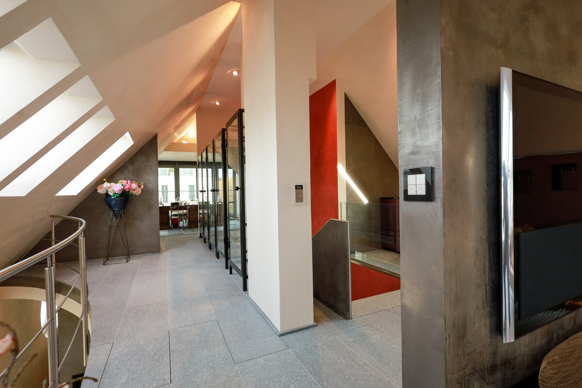 Schon beim Betreten vermittelt das Penthouse den Charakter eines großzügigen Atelier-Lofts. Über einen integrierten Smart-Home-Bildschirm lassen sich alle Funktionen intuitiv steuern: Beleuchtung, Beschattung, Raumklima, Sicherheit sowie sämtliche automatisierten Elemente greifen harmonisch ineinander und prägen die moderne Wohnqualität.